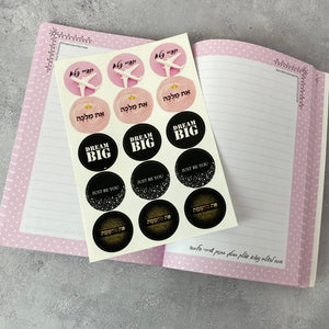 דף מדבקה : גודל 13 ס"מ על 18.5 ס"מ  ובו : 15 מדבקות עגולות בכיתובים : "תהיי פלא",        "את מלכה", "את מהממת", just be you ,dream big .