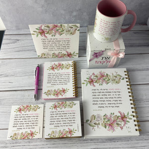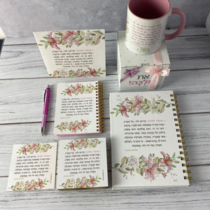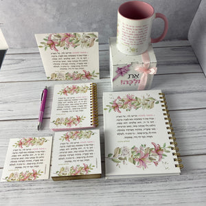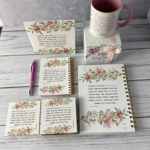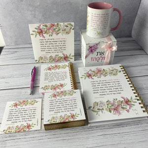 מארז מזמור לתודה לנשים - ספל + בלוק עץ + סטנד + מחברת ספירלה + מגנט קטן + עט ורוד + מחברת כיס