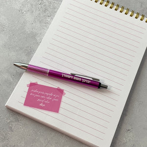 עט ג'ל יוקרתי עם גוף מתכת בצבע ורוד מטאלי, חוד מחט בתוספת חריטה בלייזר של המשפט "יברכך השם וישמרך"מגיע באריזת קופסה מהודרת מקרטון קשיח בצבע שחור  וחבק עליו רשום "את מלכה".