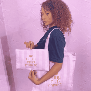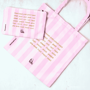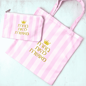 סט מושלם של 2 תיקי קנבס האחד תיק צד גודל 38*38 עם תיקתק לסגירה,ועוד תיק נשיאה פנימי עם רוכסן גודל 17*26 מהמם ביופיו ברקע ורוד פסים, בעל מראה נשי, סט אלגנטי מהמם.  בעל שיק מיוחד. בחלקם הקדמי מודפסות המילים "בוחרת להיות מאושרת" ובחלקם האחורי מודפסים 26 מסרים מעצימים: לנסות, להתלהב, לחייך, לשמוח, לעשות, לשיר, ועוד.