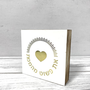 עץ בצבע אגוז, טקסט מודפס בהטבעת זהב על רקע לבן