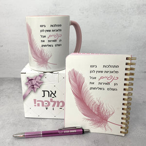 מחברת כיס וספל עם המסר: מתהלכות ביננו מלאכיות שאין להן כנפיים, אבל הן מאירות את העולם בשליחותן.