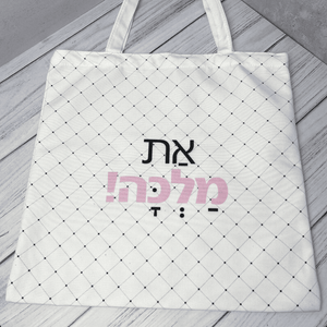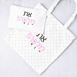 מארז מושלם של 2 תיקי קנבס האחד תיק צד גודל 38*38 עם תיקתק לסגירה,ועוד תיק נשיאה פנימי עם רוכסן גודל 17*26 מהמם ביופיו ברקע ורוד פסים, בעל מראה נשי, סט אלגנטי מהמם.  בעל שיק מיוחד. בחלקם הקדמי מודפסות המילים  "את מלכה" ובחלקם האחורי מודפסים 26 מסרים מעצימים: לנסות, להתלהב, לחייך, לשמוח, לעשות, לשיר, ועוד.