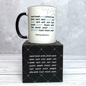 על הספל כתוב: ויש בעולם מורים נדירים שיודעים לכתוב על הלוח שבלב, מסרים של כוח אהבה ואמונה, שישכנו בו לעולם,