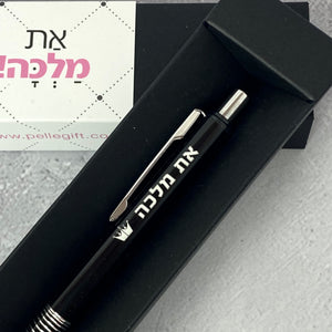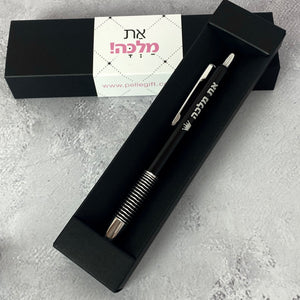 עט ג'ל יוקרתי עם גוף מתכת בצבע שחור, חוד מחט בתוספת חריטה בלייזר של המשפט