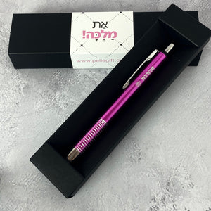 עט ג'ל יוקרתי עם גוף מתכת בצבע ורוד, חוד מחט בתוספת חריטה בלייזר של המילה "מבורכת"