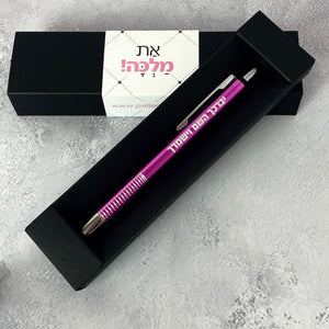 עט ג'ל יוקרתי עם גוף מתכת בצבע ורוד מטאלי, חוד מחט בתוספת חריטה בלייזר של הברכה "יברך השם וישמרך"