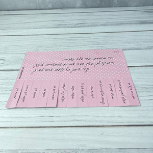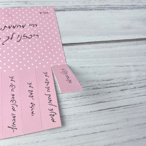 במרכז הכרטיס – מסר מחזק ומעצים. בחלק התחתון – 13 פתקיות לתלישה עם מילים טובות שאפשר לקחת לדרך, לתת לחברה, להשתמש כסימניה, להשאיר על שולחן בעבודה, או להכניס ליומן האישי.