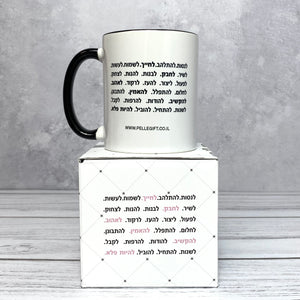 ספל שחור לבן, מהמם ביופיו, בחלקו הקדמי כתוב תתחילי שוב. שחררי כל מה שיש לך על הלב. תתרגשי. תתאהבי. אל תעשי חשבון. תנסי משהו חדש, משהו שמעולם לא עשית קודם. תגלי את עצמך בזוויות חדשות. תאבדי שליטה. תחלמי בגדול. תצחקי מכל הלב ואז תעשי. מקסימום תצליחי. עכשיו תנשמי ותודי. מגיע לך