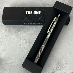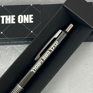 עט ג'ל יוקרתי עם גוף מתכת בצבע אפור כסוף, חוד מחט בתוספת חריטה בלייזר של המשפט "יברכך השם וישמרך"