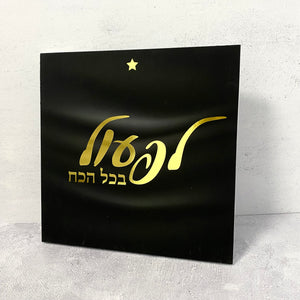 תמונה מודפסת על גבי קאפה שחורה בגימור מט עם המשפט "לפעול בכל הכח" בהטבעת זהב.