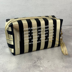 תיק איפור מהמם ביופיו זהב עם שחור עוצמתי, בעל מראה נוצץ, מרהיב ביופיו. אלגנטי ונקי. מתאים לשמש גם כקלמר. בעל שיק מיוחד. בחלקו הקדמי מודפסות המילים "את מהממת" ובחלקו האחורי מודפסים 26 מסרים מעצימים: לנסות, להתלהב, לחייך, לשמוח, לעשות, לשיר, ועוד.