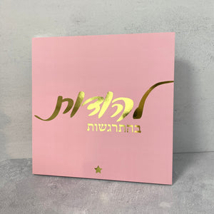 תמונה מודפסת על גבי קאפה ורודה בגימור מט עם המשפט "להודות בהתרגשות" בהטבעת זהב.